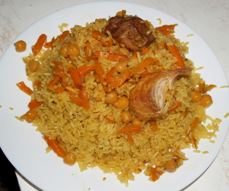 Теперь плотно закрыть крышкой и сделать огонь на минимум. Минут через 10 собрать плов горкой и проткнуть до дна в нескольких местах. Минут через 30 плов готов) Выкладывается на тарелку вначале рис, потом морковка с нутом, мясо режется на куски помельче и кладется сверху.