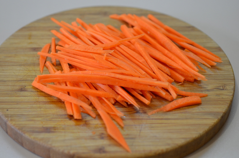 Морковь, нарезанная соломкой, уже должна быть подготовлена, т.к. лук очень быстро становится золотистым. Традиционно в Узбекистане для плова используют желтую морковь, т.к. она практически не теряет свою форму в готовом блюде. Здесь, конечно же, такой нет, поэтому берем обычную))