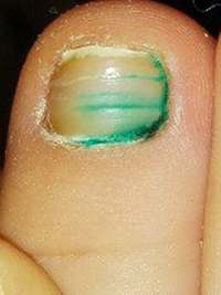 Помогите пожалуйста! У дочки (1 год 3 мес) постоянно ломается ноготь на ноге на большом пальце. Отрастает до определенной длины и сламывается ровно под корень. Потом отрастает и как только отрастает, сразу же снова сламывается. Были у хирурга, нам сказали идти к дерматологу в квд, там посмотрят и чего-нибудь посоветуют. Но мы заболели, потом снова заболели и сейчас болеем всей семьёй. Пару дней назад смотрю, у основания ногтя совсем немного запёкшейся крови, я думала может ушибла, и намазала зелёнкой. Сегодня смотрю, опять под корень сломался и у основания ногтя как будто кровь поблёскивает.