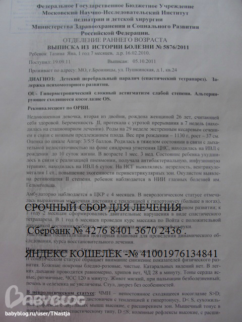 ),После лечения у Яны были новые достижения, заметно понизился тонус, научились вставать на четвереньки, пить из кружки ,ходить под руки, и в интеллекте заметны были сдвиги, очень внимательная стала к тому что её окружает…а сейчас стоим в физическом развитии, очень нужны занятия! ПОЭТОМУ, Так как лечение там нам пошло на пользу мы хотели бы еще раз попасть в институт Милошевича, уже забронировала квартиру на собранные деньги, и необходимо оплатить самолет и собрать деньги на само лечение. Институт Милошевича на 4недели =20 рабочих дней. прием врача =20е, переводчик = 30е =1200 руб., кинезотерапия - 11евро* 20дней =220е=9тыс, жемчужные ванны =9,5 * 20дней= 95е= 7600руб, кинезотерапия в ванной – 11евро *20 дней = 8800,на дому: БОБАТ 1 час- 25 евро 28 дней = 28 000руб. перелет туда и обратно = 33670руб на меня и на Яну, Проживание без питания – 40е сутки *33дней = осталось доплатить 36 000руб