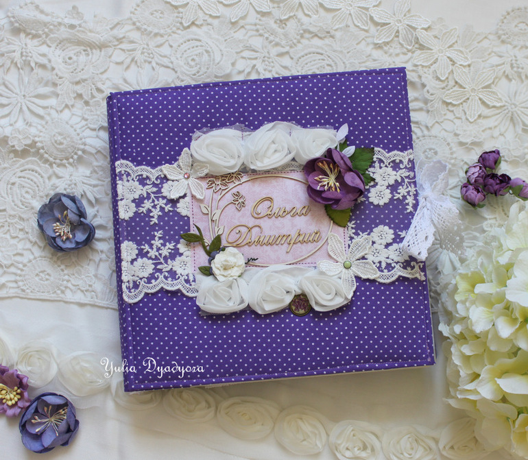 Привет, привет мои хорошие! Сегодня хочу показать вам свадебный альбом который был выполнен по СП С Катюшей. Размер альбома по обложке 26*21 см, размер самих страничек 25*20. В альбоме можно разместить 50 фотографий размером 9*13 и 3 фото меньшего размера. Обложка мягкая тканевая завязывается на атласные ленточки. Надпись на обложке выполнена из чипборда который покрыт голографической пудрой для горячего эмбоссинга, на солнышке очень красиво переливается.