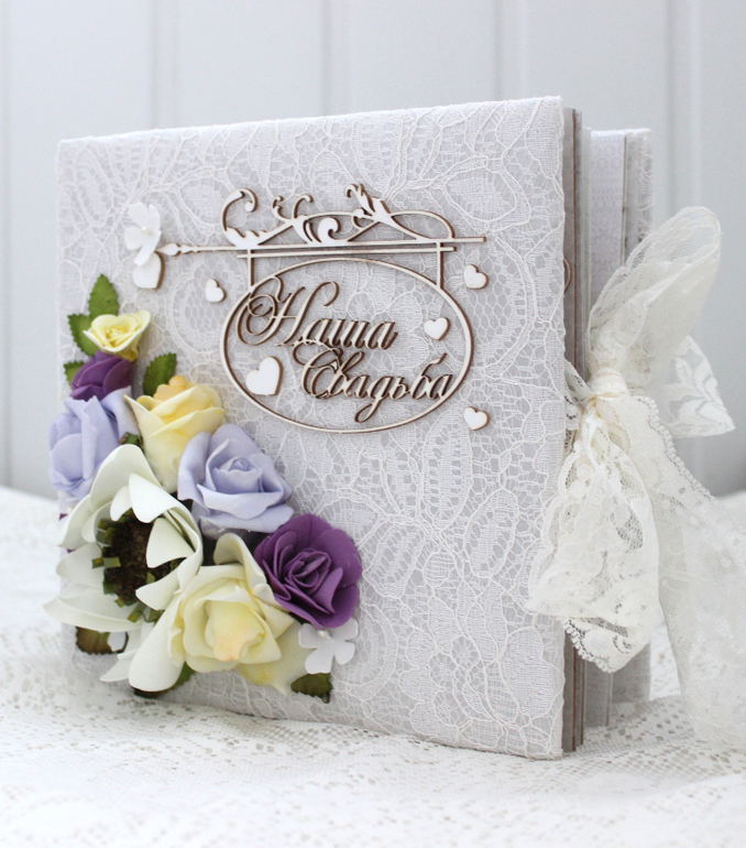 Свадебный скрап-альбом в сиренево-белых тонах вмещает 85 фото 10*15см + есть кармашек для дополнительных фото