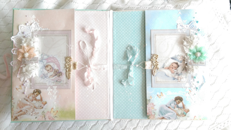 Хотелось бы заказать альбом для близнецов. Девочкам уже 10 мес., а руки у мамы пока не дошли до заказа :( Хотелось бы в нежных тонах, романтического стиля. Никогда не заказывала, это будет мой первый опыт. Буду рада вашим предложениям. Очень нравится работа найденая на просторах интернета. И хотелось бы в таком же или похожем стиле (как на первом фото) а чтобы открывался в разные стороны (как на втором фото).