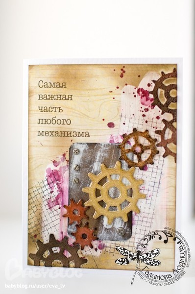 В общем, решила я сделать открытку для папы, ведь он у меня большой рукодельник. Идея с шестеренками пришла быстро. Вот шестеренки покрашены, залакированы, осталось сделать фон! Тут-то и приключилась беда...