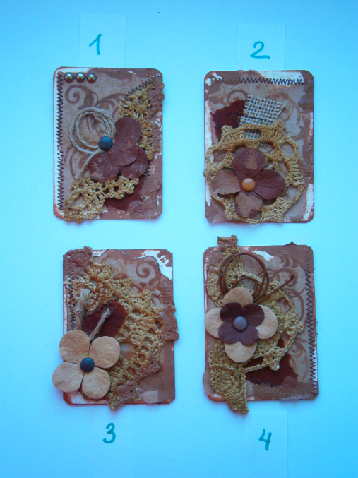 Никак не могу отойти от винтажной темы. Вот и родилась такая серия АТС-очек. Кружево связано крючком, состарено в кофе и запачкано краской кракле