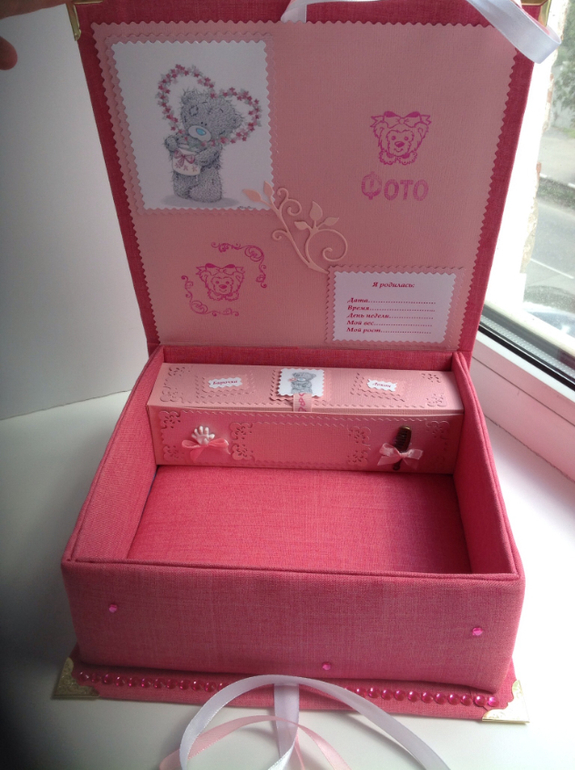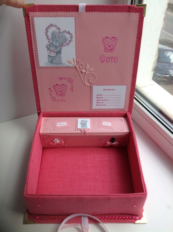 Внутри всего одна коробочка для первого срезанного локона и бирочки с ручки малышки, если честно, то мне самой очень нравится такой вариант, так как не возможно угадать, какие мелочи мы посчитаем ценными для хранения :) а вдруг найдется первая любимая погремушка или пустышка... Первая свеча с тортика :) или первые носочки :) эта коробочка высотой 7 см., поэтому и первые сандальки даже войдут :)) или первая одежда :) думаю Наталья найдет, что хранить :)