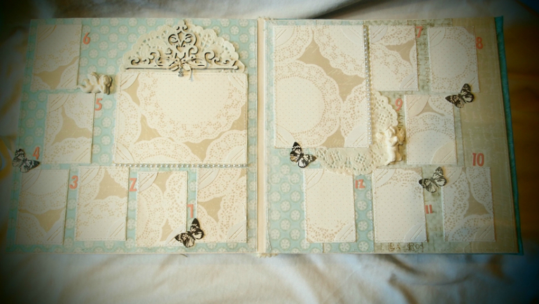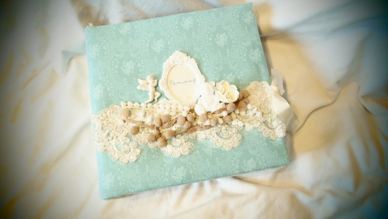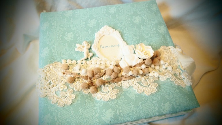 Альбомы ДетскиеПривет. Хочу показать вам работу над которой трудилась эти полторы недельки. Большой 25на25 формат, на 18 стр, вмещает около70 фото(10на15 и 9на13)+ маленькие. Обложка мягкая,ткань тильда, на обложке итальянское кружево,розшитое бисером и паетками вручную). Альбом выдержан в мятно-бежево-голубых оттенках.Смотрим