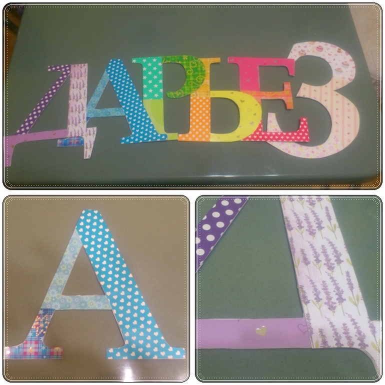 На носу День Рождения дочки. Решила сделать растяжку с ее именем. Вырезала буквы, все склеила, осталось украсить. И тут я понимаю, что запас моей фантазии на этом исчерпан. Поэтому очень прошу помощи и совета!