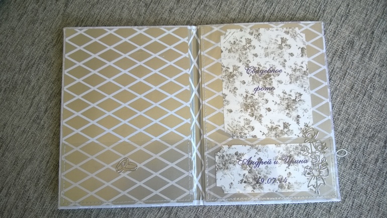 Внутри меня ждал очень неприятный сюрпирз: пришила прозрачные кармашки, файлик, приклеила, положила под пресс, открываю, а там.... фрагменты фольгированной бумаги кусками отпечатались на файлике! сам файлик я ацетоном отмыла, а вот что делать в испорченной бумагой - не знала. Ничего не оставалось, как приклеить подложку для фото, а для гармоничности на кармашек приклеить бумажку с именами и датой.