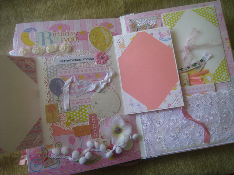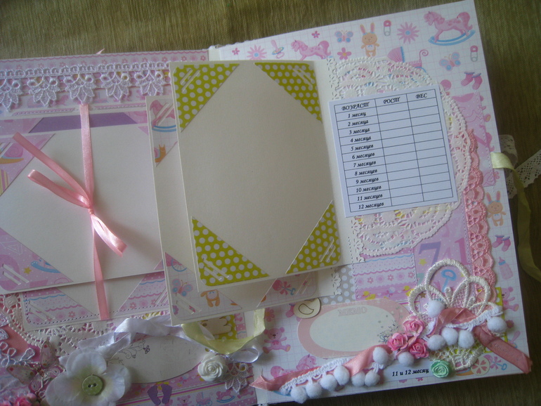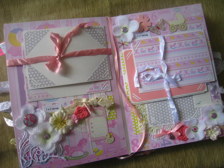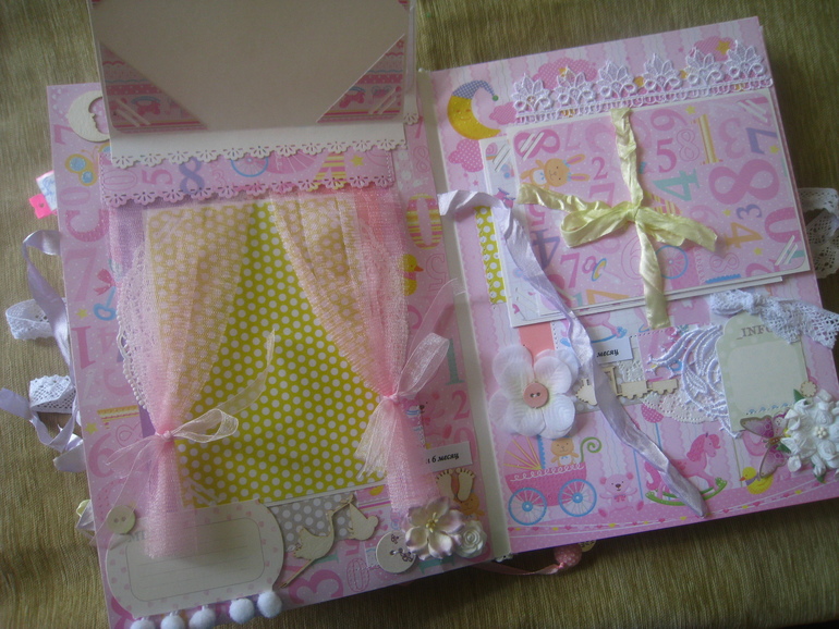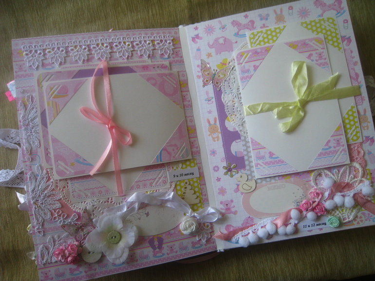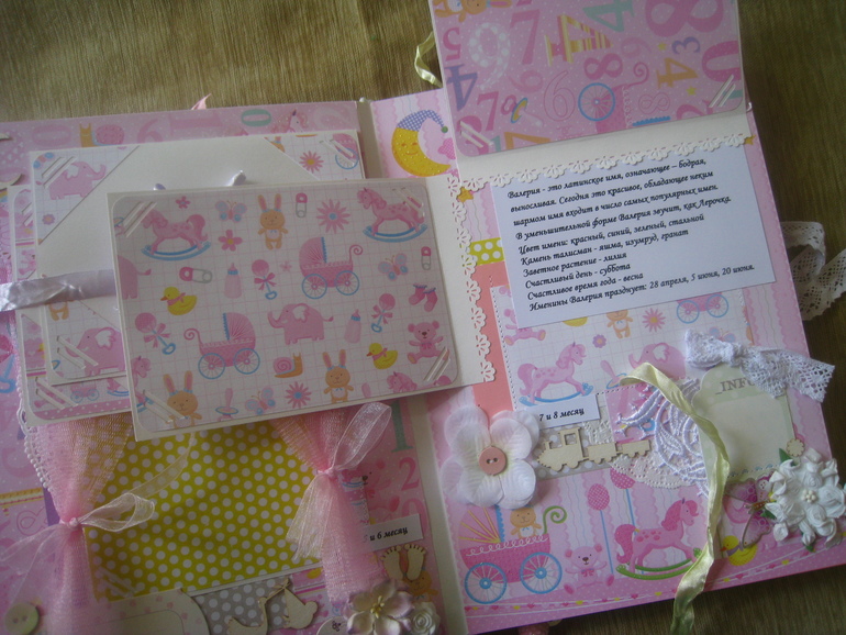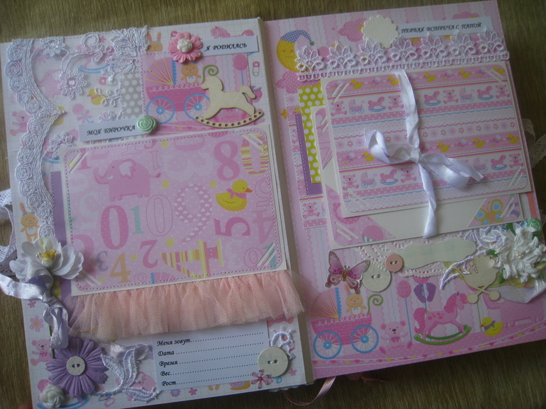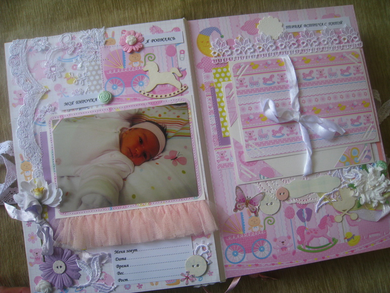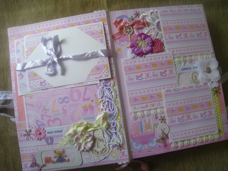Альбомы ДетскиеВсем привет! Хочу сегодня показать вам свой новый альбом, который делала для замечательной девушки Евгении и ее малышки Лерочки. Альбом получился от рождения и до года включительно, также есть странички про ожидании малышки, рождение, семью. В альбоме есть текст (значение ее имени, ее талисманы). Обложка мягкая, ткань из коллекции Тильда. Получился очень объемный почти 6 см, формат 29 на 21 см, 6 разворотов, поместилось около 50 фото 10 на 15, красивый кружевной карман для дополнительных фото, таблички - ножка, ладошка, метрика. Спасибо всем за просмотр!