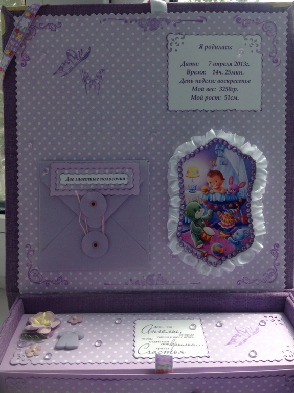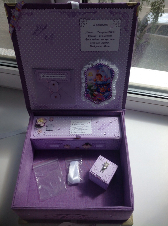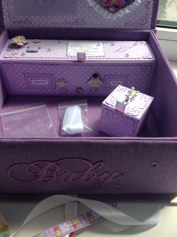 Коробки, шкатулки, комодыУра!!!! Свершилось!!! Катерина, ваша шкатулочка готова!!! Я очень благодарна вам за ожидание!!! Если что не так, пишите!!! :) На этот раз вместо декоративной бутылочки у меня маленькая коробочка, просто нет пока их в продаже... :( Коробочка малюсенькая, надпись не вошла, а украсить ее хоть маленько очень хотелось! А так все на месте-пакетик для первого срезанного локона Сашеньки и ленточка для бирочки из роддома тоже есть... Ну вот собственно, фото ниже :)