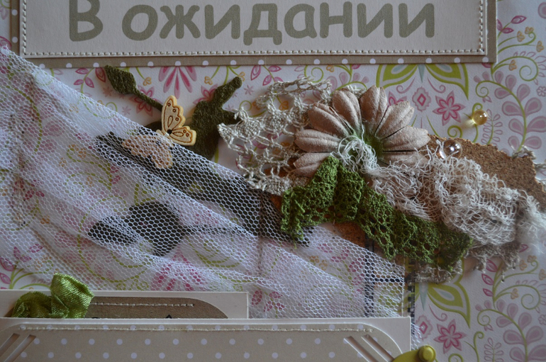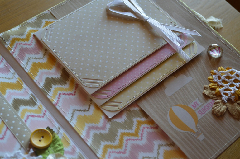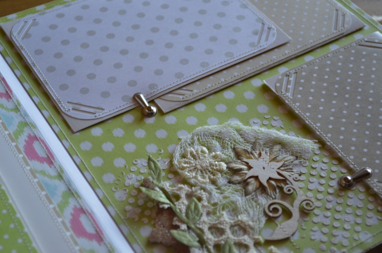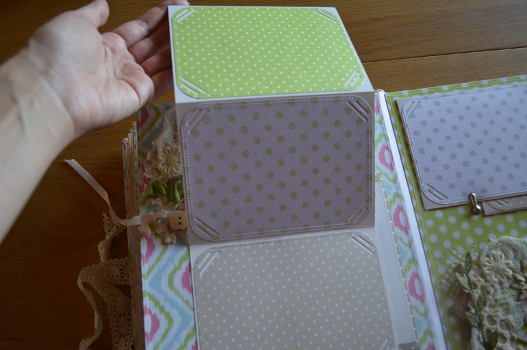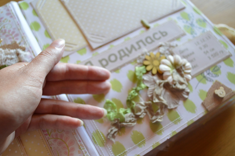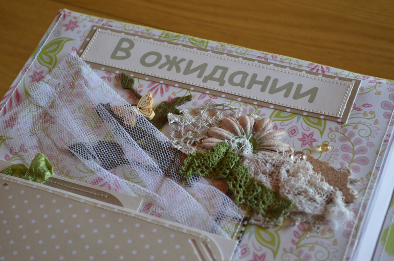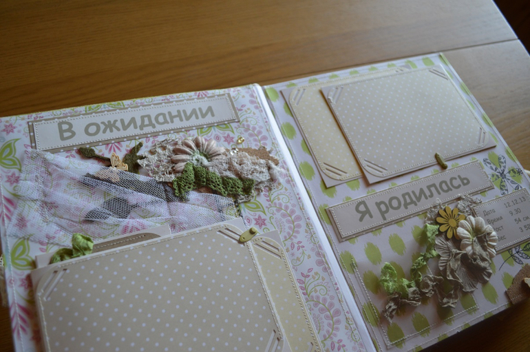 Первый разворот - беременность мамы и рождение девочки. Здесь книжечка для фото УЗИ, карман для бирочки, метрика..