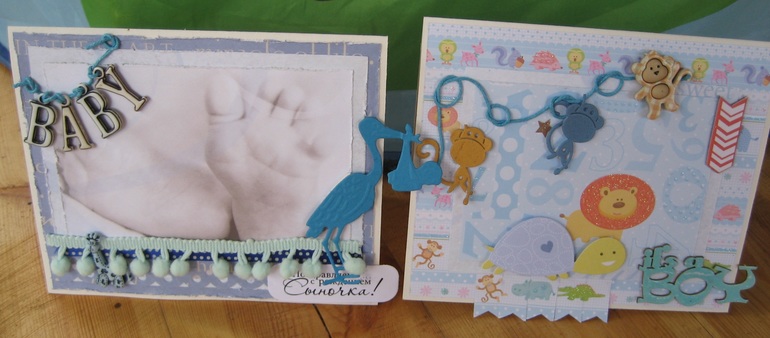 Открытки, приглашения, визиткиХочу показать одну небольшую работу.Так получилось, что всего в разницу в неделю у нас в семье появилось двое малышей)) Сначала мамой стала крестная нашей принцессы, а потом моя сестра родила сынишку и по этому случаю вот такие появились открытки: