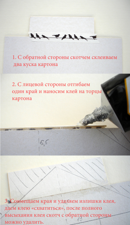Круглая крыша нужного мне диаметра на мой лист не влезла, поэтому я вырезаю ее из другого куска и подклеиваю с фону. Сначала переворачиваем фон на изнанку, и склеиваем скотчем (лучше бумажным) два кусочка, затем переворачиваем на лицевую сторону, отгибаем один кусок и открывшееся торцы картона мажем клеем, я использую "Момент-кристалл". Затем закрываем торцы обратно и убираем излишки клея, не бойтесь испачкать фон, он будет закрыт бумагой, но постарайтесь все делать аккуратно без "соплей", клей в углах легко удалить деревянной палочкой, я взяла палочку от мороженного и срезала один ее край под небольшим углом, вот такой получился инструмент.