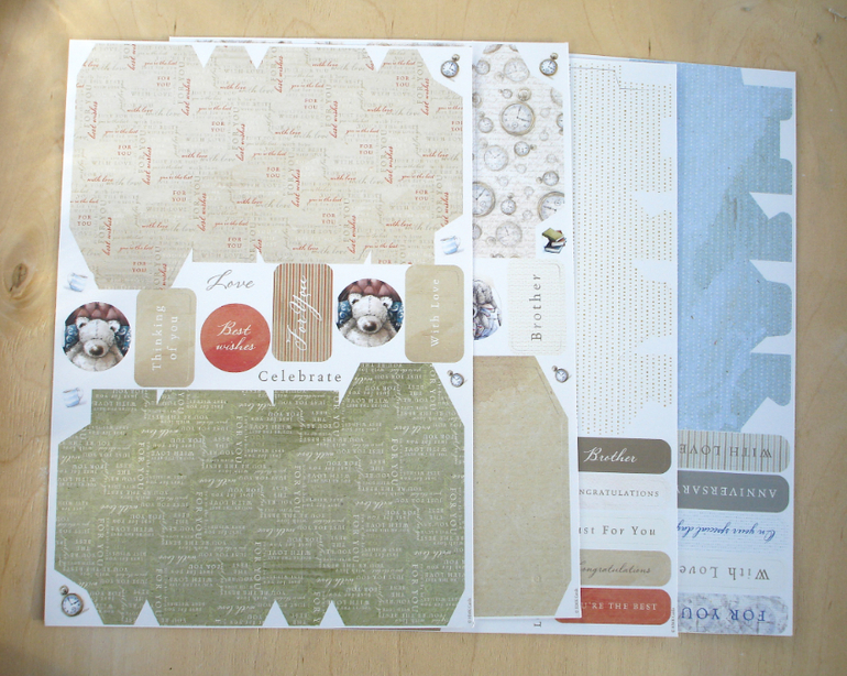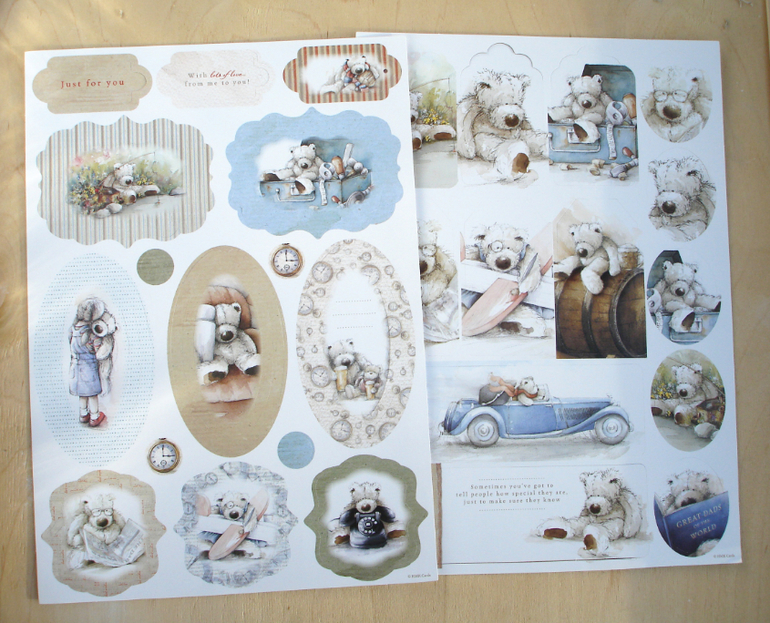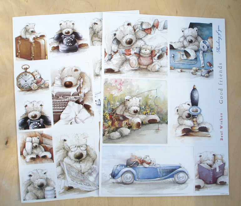 Материалы для скрапа В ЖИВУЮ, отзывыВот такую я получила вчера бумажку, решила показать. Бумага односторонняя тонкая, мелованая, все дизайны (11 дизайнов по 2 шт.) показаны на обложке, но это не главное, главное, что в наборе 26 листов высечки! Правда эти листы с коробочками непонятно куда пристраивать. Есть просто картинки, рамки, слова, два листа с наклейками-алфавитом, несколько зд-картинок. Я думаю любители медведей будут в восторге!