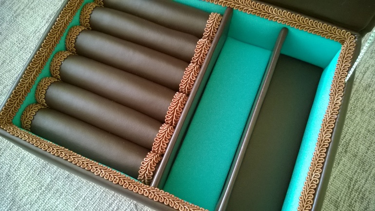 Шкатулка 15 на 20, преимущественно для колец. Тут меня вообще накрыло... Габардин на стенках в уголках лег не так, как мне хотелось, я долго думала и искала у себя чем прикрыть, ну и в итоге вышло то, что уже вы видите: