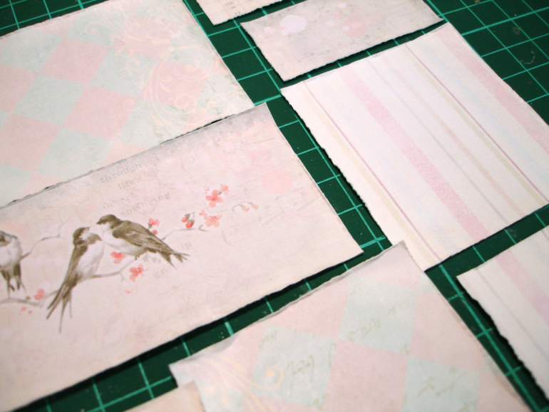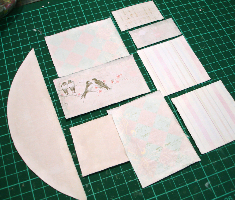 Начнем сначала, я взяла три вида бумаги, которые подходят друг к другу и вырезала прямоугольники по размерам ячеек, кроме тех, где фото закроет всю ячейку, чтобы не ошибиться, примеряйте бумагу для каждой ячейки.