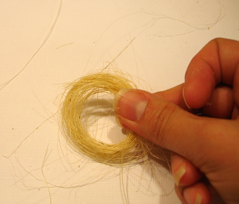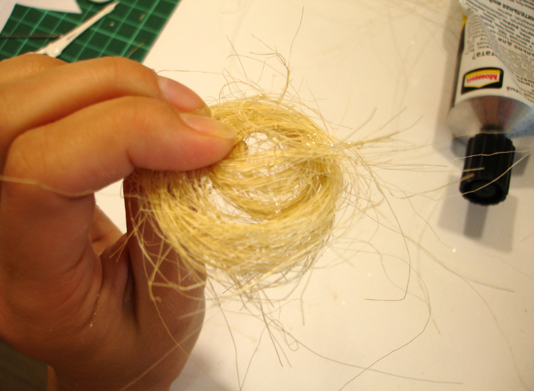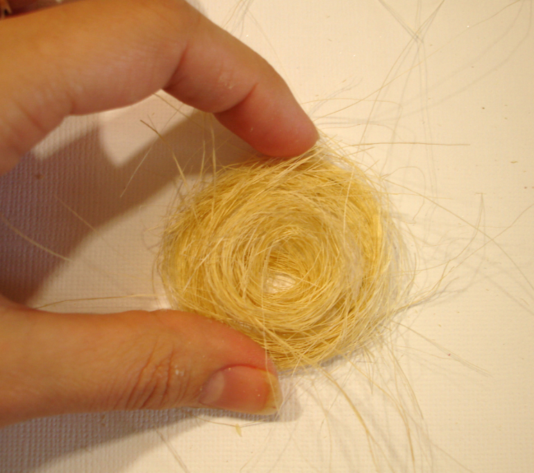 Затем берем следующую прядь поменьше и скручиваем ее в кружок - это донышко гнезда. Теперь слегка мажем клеем одну сторону гнездышка (она будет со стороны стенки и следов клея будет не видно) и донышко, его тоже будет не видно, распределяем клей по волокнам, чтобы гнездо не раскручивалось, его можно слегка мазнуть белым акрилом, для гармоничности со всем ШБ. Если много волокон торчит - обрежьте их ножницами.