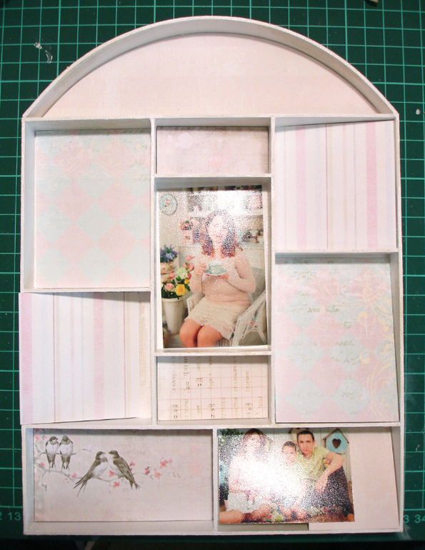 Далее нужно бы фоны приклеить, но я вам советую этого не делать пока, иногда легче приклеить объект на бумагу, а уж потом все вместе вклеить в ячейку, на что клеить? Фото я рекомендую на КЛЕЙ МОМЕНТ не клеить! Со временем клей усаживается, или фото так реагирует, короче говоря, фото может изогнуться (есть такой опыт), так что клейте на скотч, зачем рисковать? А вот бумагу я клею на клей момент кристалл, клей близко к краю я не наношу, что бы избежать его "вылезания".