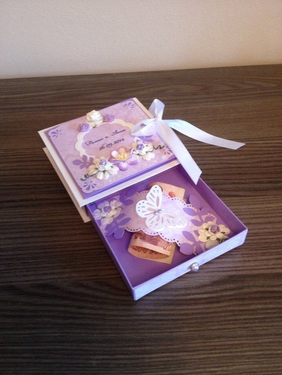 Знакомая идет на свадьбу и попросила меня сделать коробочку для денег, в ней есть место для пожелания молодым, которое дарители решили написать сами) смотрите, что получилось)