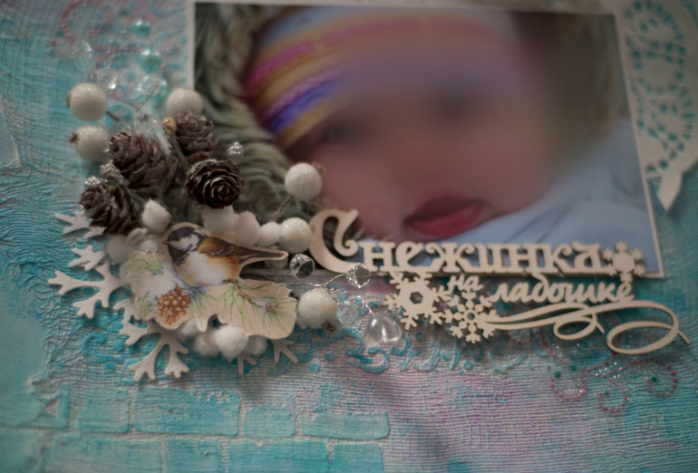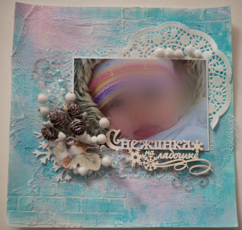 Первая страничка про зиму. Фон самодельный полностью. Использовала бинт, текстурную пасту, акриловые краски, маски.