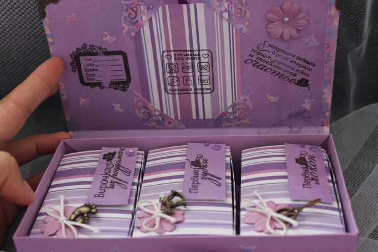 Здравствуйте Евгения, мне на вашей коробочке очень понравились "фигурки" (не знаю как правильно называется) коляски, следов, погремушки, аиста, подскажите пожалуйста, где вы её купили или заказали? (если не трудно, напишите ответ на почту Ivik_2010@list.ru) Очень буду ждать ответа