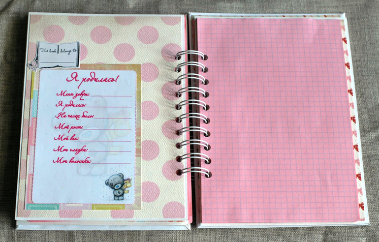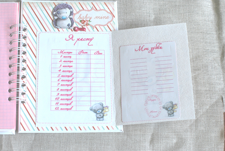 В блокнотике 3 разделителя, есть места для фото, пара кармашков, места для отпечатков и метрики)