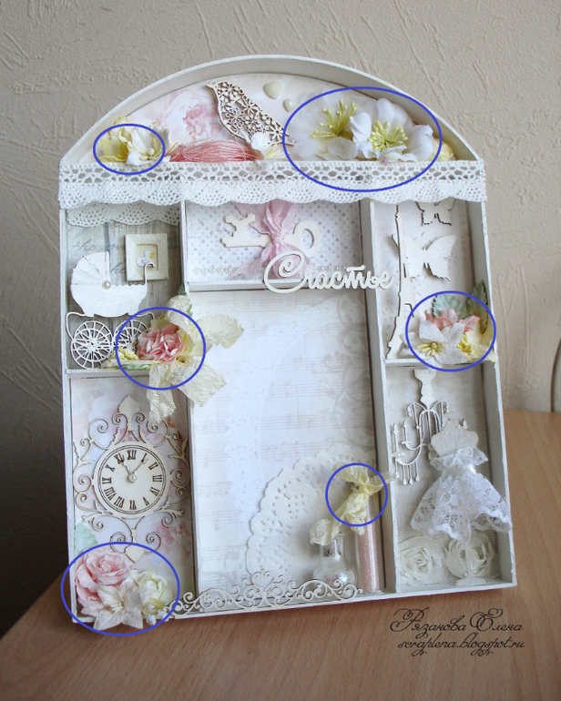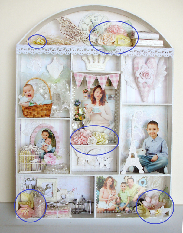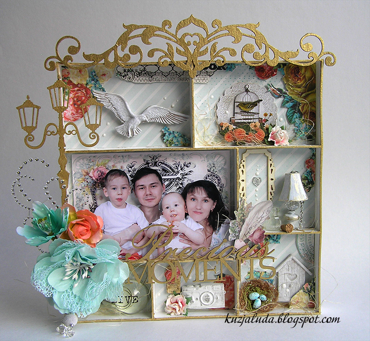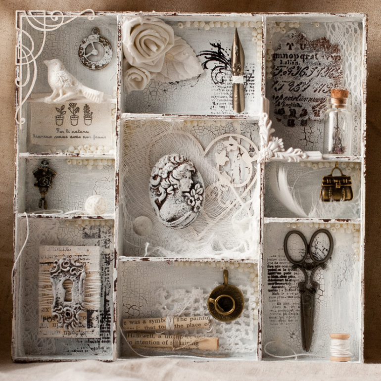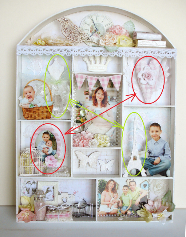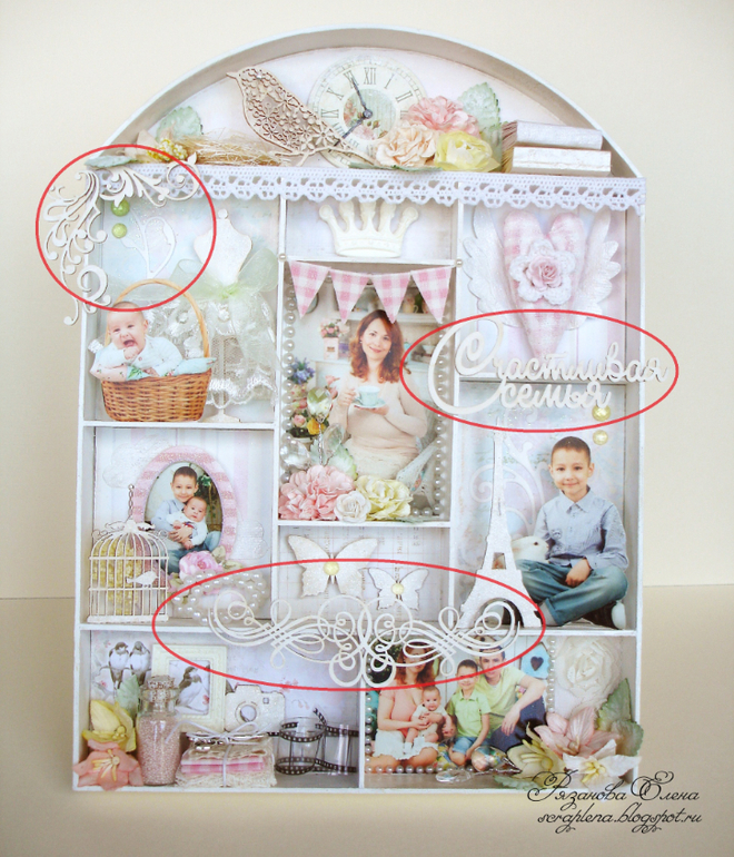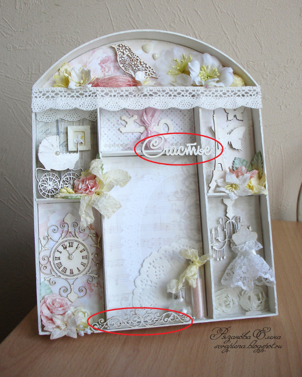 СОВМЕСТНЫЕ ПРОЕКТЫЗдравствуйте, девочки, сегодня последний этап по нашему СП (спасибо за ваше терпение и понимание моей ситуации), думаю вы уже обдумали свой шадоу бокс, теперь давайте все соберем вместе. На самом деле, у меня редко первоначальный план совпадает с итоговым результатом, все меняется по ходу работы, бывает все что хочется в одну ячейку не влезает, а потом бывает что ячейку заполнить нечем. Поэтому не бойтесь перегруппировывать и менять местами, очень удобно если у вас есть фотоаппарат или какой-никакой телефон с камерой, сфотографируйте несколько вариантов, потом пересмотрите и выберете, опять же по фото потом можно все заново и сложить, а то я частенько несколько проектов делаю одновременно и моей памяти на все не хватает, по фото вспомнить гораздо проще. Итак, давайте начнем "с конца", мне вот так кажется удобнее. Мы уже говорили о трех плоскостях ШБ (фон, наполнение ячейки, украшение торцов перемычек). Начнем с украшения перемычек, мне нравится когда это "слово", у меня есть довольно много русскоязычного чипборда с надписями, вот его я и использую. На самом деле, можно надпись разместить и в ячейке, главное его как-то выделить, что бы оно привлекало взгляд. Еще я люблю завитушки. Располагаем все, чем вы хотите украсить торцы на ШБ, распределяем равномерно, что бы не "в одной куче". Пока их не приклеивайте, иначе не удобно будет заполнять ячейки.