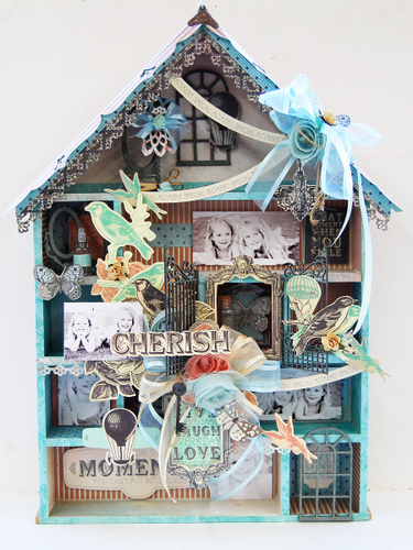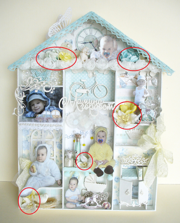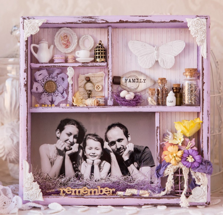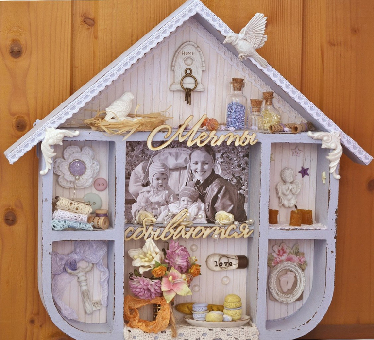 Теперь о смысловой нагрузке. Ваш ШБ может быть просто "витриной", т.е. просто демонстрацией красивых вещичек. Это может быть "дом", в котором каждая ячейка -это комнатка с соответствующим наполнением. Я старалась наполнять рамки смыслом, вот смотрите самую первую рамку. Она сделана для мамы на день рождения и вот какой смысл я вложила в нее. Птичка в гнезде - это символизирует материнство, мама у нас очень заботливая и любящая всю свою семью МАМА. Коляска символизирует мое пожелание "новых" внуков и то, что и сейчас мама у нас самая настоящая бабушка, активно занимается внуками и с колясками гуляет регулярно! Ключ - это пожелание крепкой семьи и то, что она у нас хозяйка во всех смыслах. Башня символизирует пожелание больших путешествий, она у нас это любит, бабочки - легкость и мечты. Манекен с юбочкой - пожелание оставаться такой же красивой мамулей (а еще она у нас очень хорошо шьют и вообще рукодельница). А часики - пожелание долгих лет и побольше свободного времени на себя, ведь любой самой заботливой мамочке и любящей жене всегда нужно время на себя! А бутылочки можно трактовать как хозяйственность, мамуля у нас прекрасно готовит!