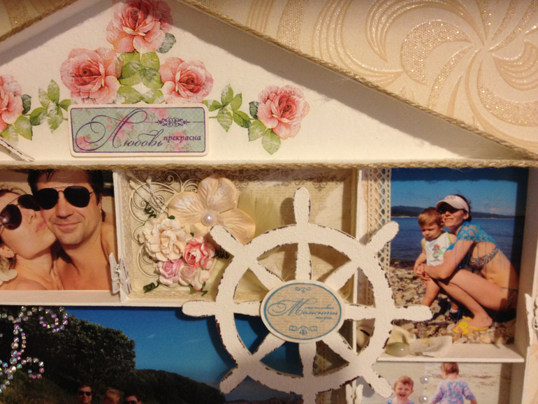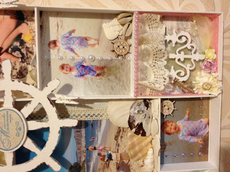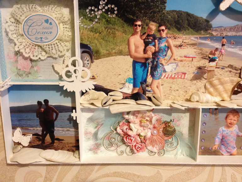 Не собиралась я участвовать в СП, но помог случай))) У нас с мужем вторая годовщина свадьбы была 22 сентября, она же в народе "бумажная". Так как я нахожусь в декретном отпуске, то особыми средствами я не располагаю, а тут просматривая ленту увидела СП, уже правда этап третий. И тут меня озарило!!! Что мужу вполне себе можно сделать подарок своими руками. Трудилась я неделю. А тематика ШБ изначально должна была быть свадебной, но потом я передумала и решила, что свадебных фотографий и так у нас много и в разных видах (альбом, коллажи), поэтому выбор пал на наши фото с моря!!! И вот что получилось...