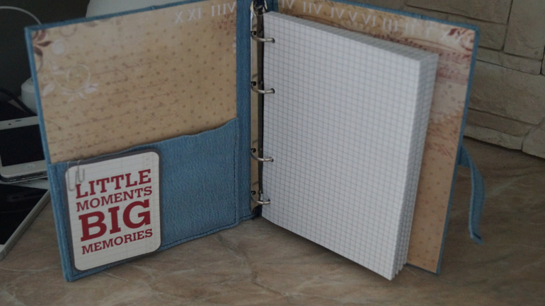 Классная обложка и кармашек напервом форзаце, такая нужная вещь. А вы оформляли готовую тетрадь? Тогда как вы запихнули ткань под железку с кольцами, у меня так не получилось. :((((
