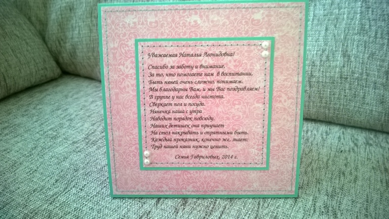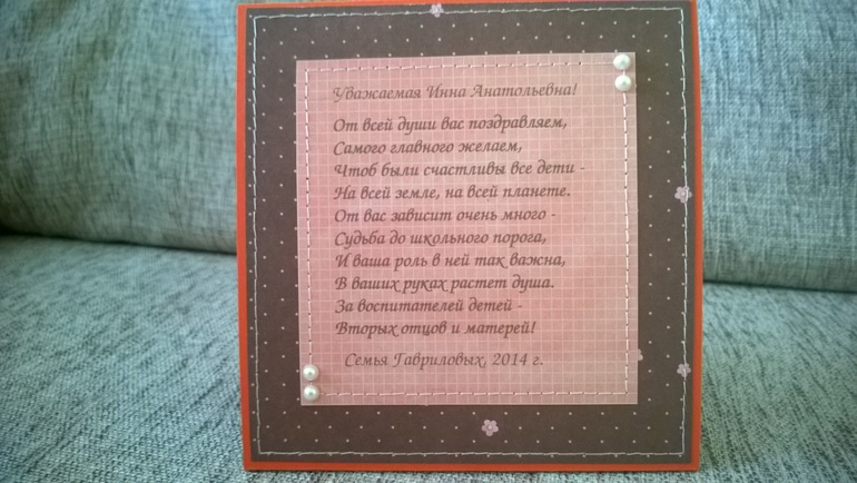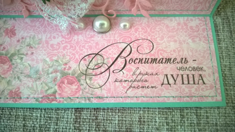 Отдельно дня воспитателя в Беларуси нет, есть день педагога и мы одновременно поздравляем и учителей, и воспитателей. Сын мой заболел, поэтому я делала только для сада. У нас новые воспитатели в этом году, одна - бывший учитель математики, в школе отработала 35 лет. Строгая, четкая, но любит детей. Вот ей я и делала повтор школьной.