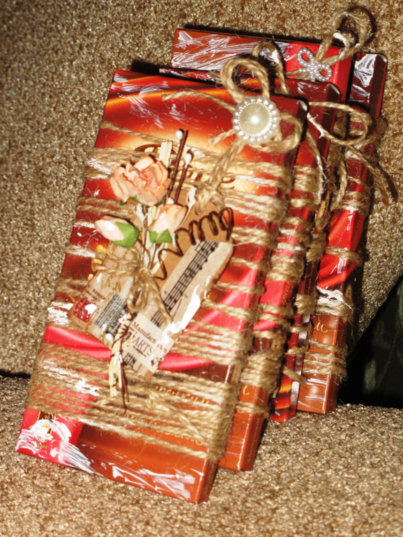 Мне понравилась и шоколадница и упаковка. Очень красиво. Еще шоколадки можно было в крафт бумагу завернуть и так же завязать, тоже красиво было бы. А композиции сами по себе очень хорошо подобраны и украсили бы любой подарок.