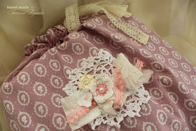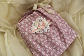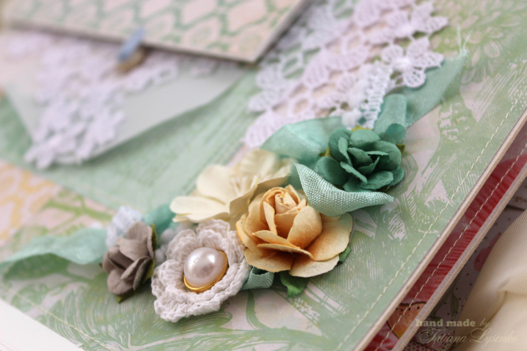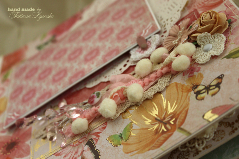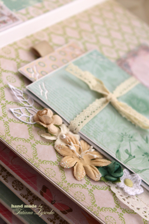 Итак, формат альбома 24*28 см, 6 разворотов (12 страниц). Ручной переплет, обложка обтянута тканью Tilda, внутри альбом сделан полностью из бумаги DCWV Batterfly Garden и дополнен красивыми кружевами и украшениями Prima. Вмещает в себя 68 фото стандартного размера 10*15 см, 2 тэга для фото меньшего размера, а также на последней странице альбома есть два больших кармана для дополнительных фото и прочих памятных вещиц. Есть в альбоме карточки для записей, кармашки для бирочки или других ценностей родителей, а также крафт-конверт. например, для локона малыша. В комплекте с альбомом идет тканевый мешочек для хранения.