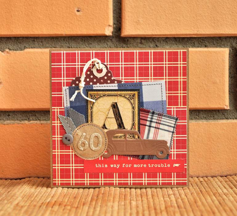 Основа из плотного крафт-картона, бумага - космо-крикет, карта белла, графика ( все - обрезки), кусочек клетчатой ткани в тон, два вида тесьмы, шнур, пуговка. Буква А - это от имени юбиляра - Александр. Крафтовый кружок с затонированной и покрытой глосси 60 мягко намекает на знак ограничения скорости) ( я тут на права учучь, у меня в голове только одно и крутится))))