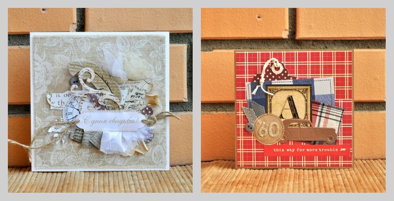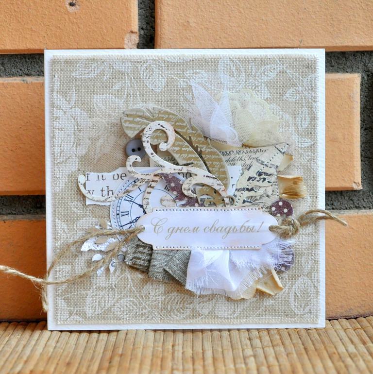 В качестве фона - кусок ткани, использованы вырезки из скрап-карты, вырубка и дырокольности, вырезанная карточка от Скрапберриз, отштампованный кусочек льна, шифон, шнур, бечевка, фатин и кружево, часть вырубки украшала и тонировала сама, лепестки цветов тоже)