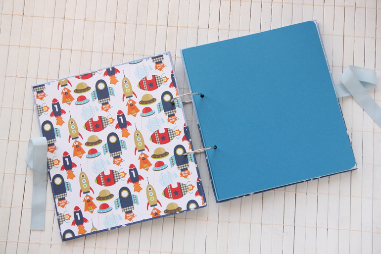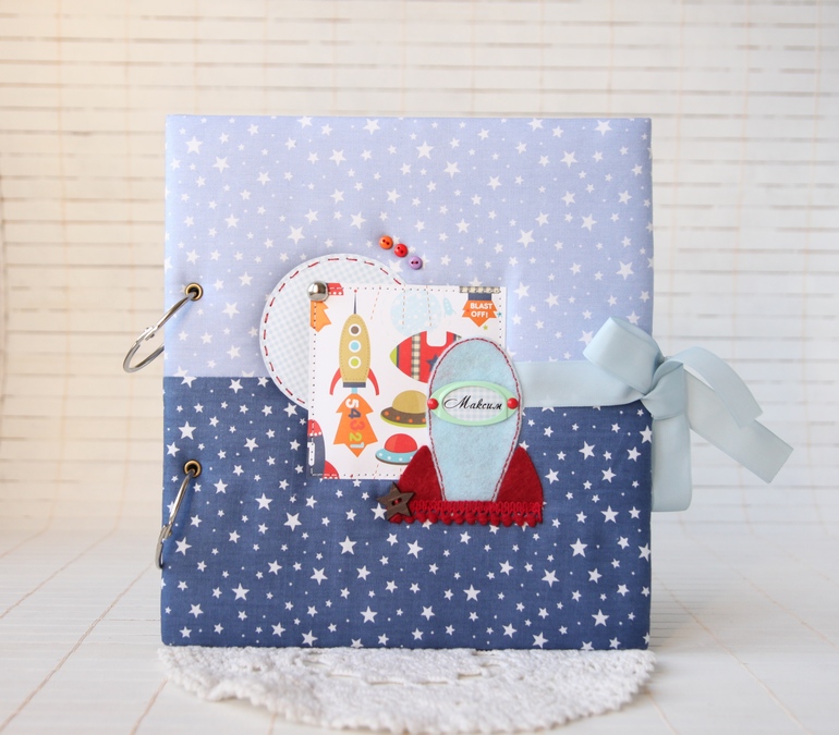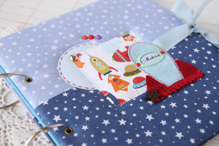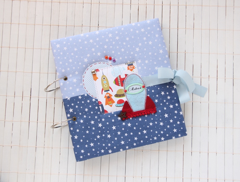 Размер 22*24, ракету вырезала из фетра. Нравится мне использовать в детских альбомах этот материал, придумать можно все что угодно))) нужен паровозик или зеленый футбольный мяч - пожалуйста, ракета голубого цвета - легко!