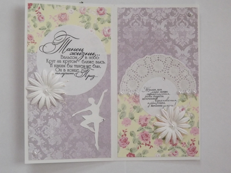 Выношу на суд свои первые открыточки... Вообще скрапом занимаюсь не очень давно, но как всем новичкам, наверное, мне хочется попробывать себя во всех эпостасях. Первым изделием стал семейный альбом в стиле херитаж в подарок маме (фото будут позже, подарок уже ушел адресату), теперь вот открыточки учителю по скрипке и по хореографии. Чтобы впечатление от моего творчества было приятным закрепила его конфетами.А это внутри.