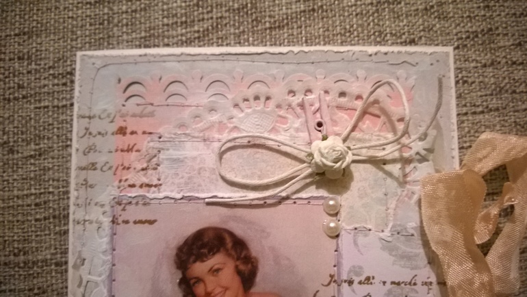 На последней остановлюсь подробнее. Всегда хотела попробовать шебби, посмотрела мк Даши и уже из того, что было, смастерила. У меня закончился весь декор. Открытка для свекрови, она рисует, поэтому подумала, что поймет все: порванные края, трчащие нитки, неровную строчку и мазюки акрилом.