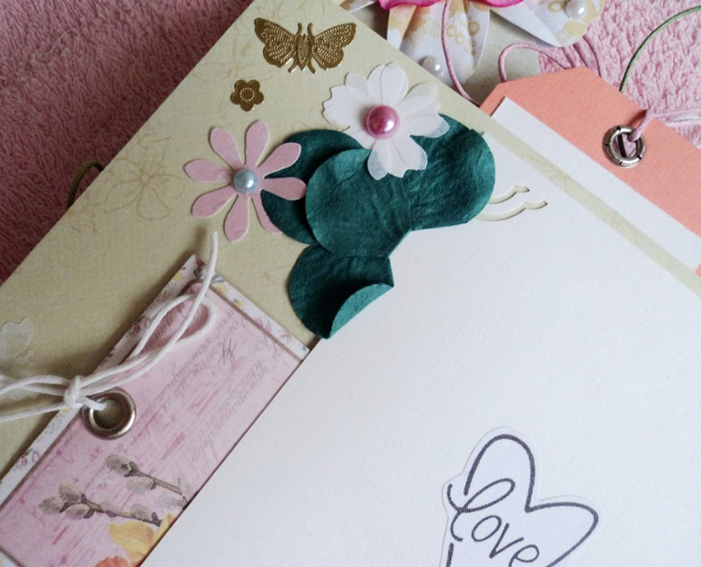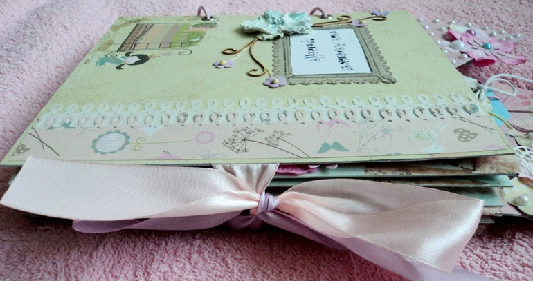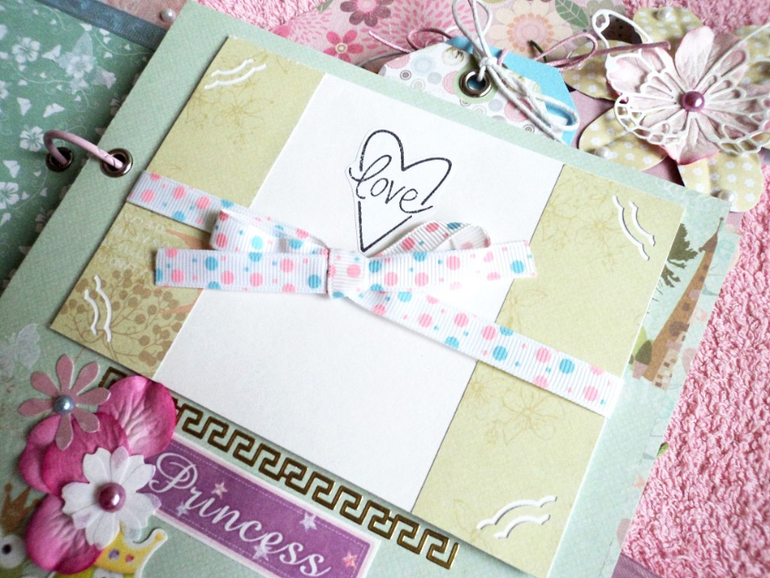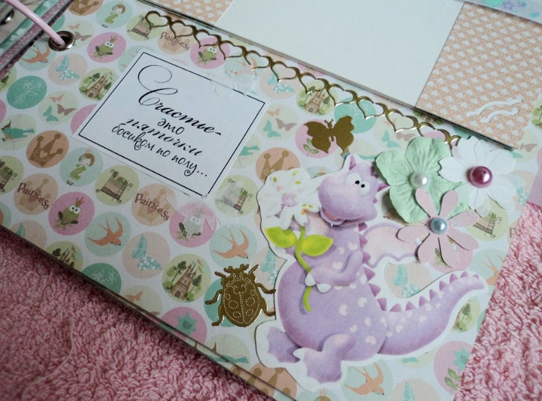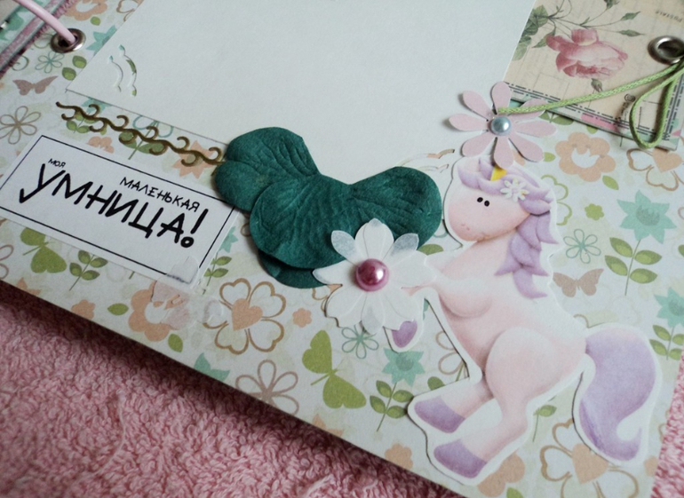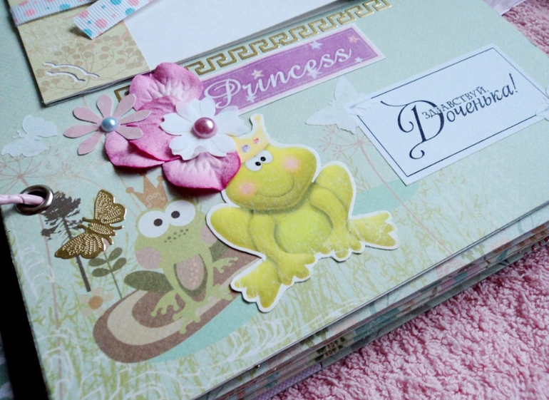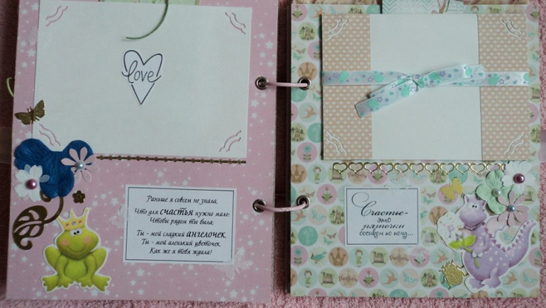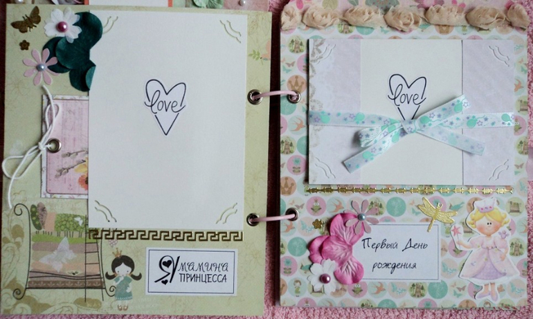 Альбомы ДетскиеЯ с новым альбомом))) 8 разворотов, вмещает около 25 фото, есть кармашки, секретики, Альбом выполнен в нежной цветовой гаме, украшен жемчужинками, цветами, бабочками - для настоящей принцессы) Итак, смотрим...