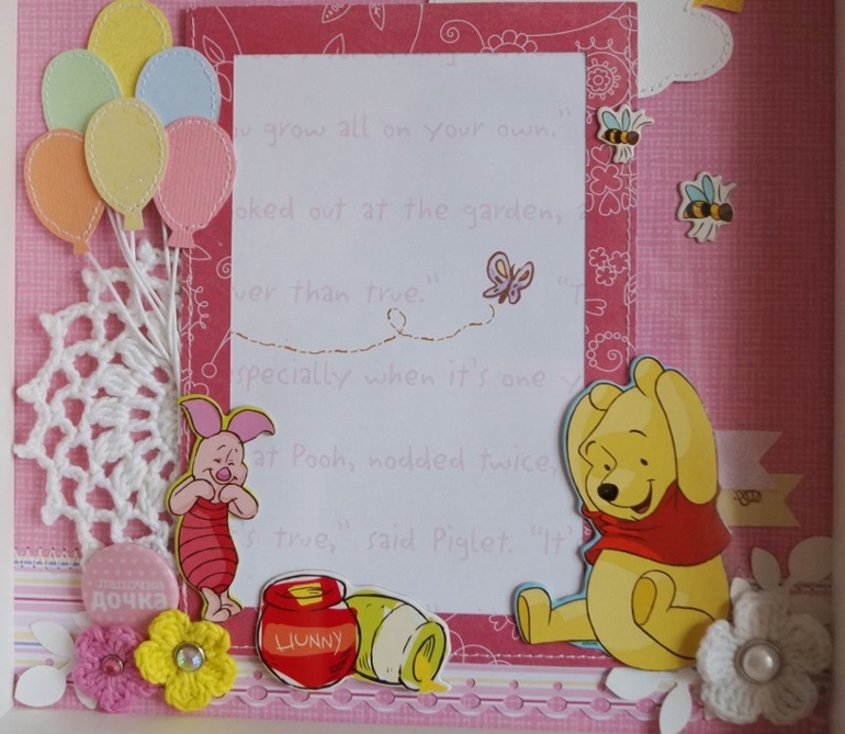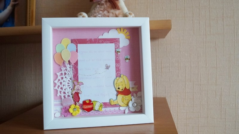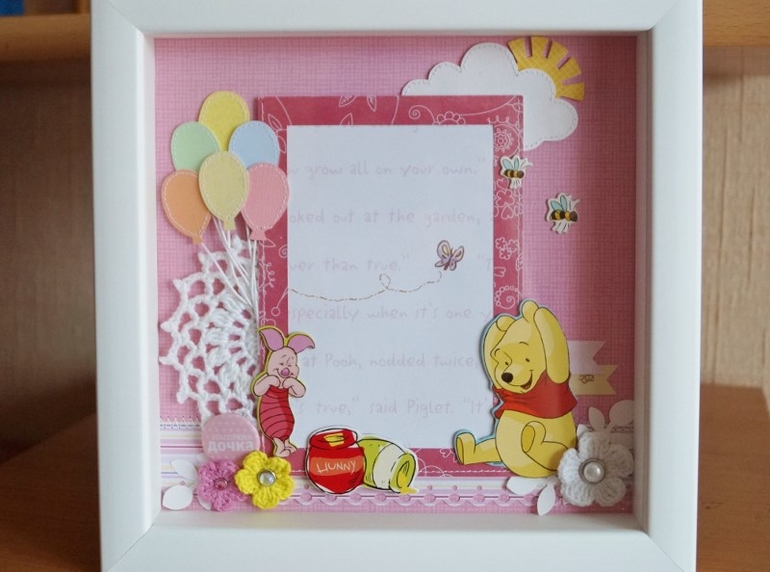 Рамки, магниты, настенные пановсем доброго времени суток! хочу показать вам новую мою работу - рамочку для фото. Внутренний размер 20х20, фотография 10х15. Саму идею слифтила у Светланы http://www.babyblog.ru/user/lenta/sapsap. Очень долго мне не давал покоя ее потрясающий Винни-Пуховый альбом, а тут повод образовался - полгодика одной знакомой малышке.