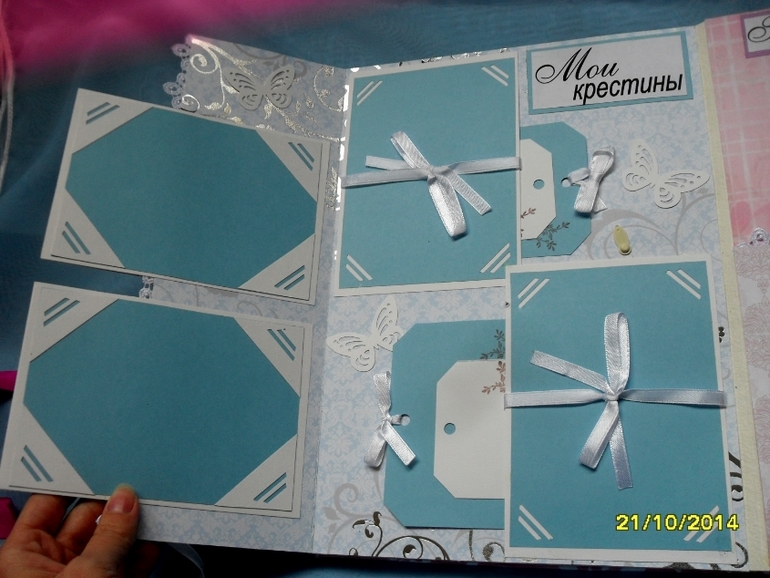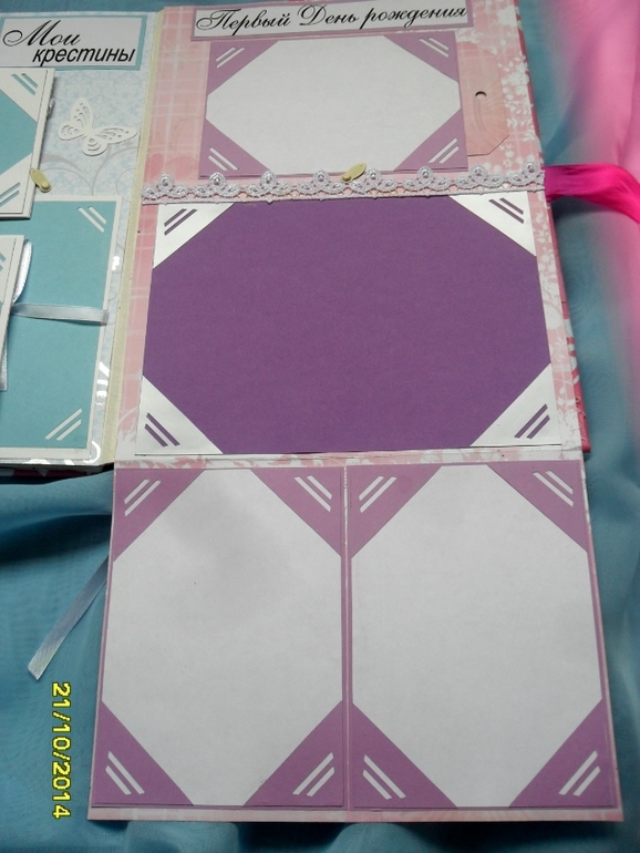 Альбомы ДетскиеДобрый день. Хочу вам показать очередную работу- альбом первого года жизни для девочки Вероники. Заказщица попалась очень вежливая, тактичная, мягкая, НЕ КАПРИЗНАЯ, полная противоположность предыдущей. Она решила сделать альбом для своей крестницы на день рождения, как дополнение к основному подарку. Поэтому основным требованием у моей заказщицы было: нежные и романтичные цвета, минимум украшений и всего 4 страницы, которые будут отражать основные моменты жизни малышки: рождение, выписка из роддома, крестины и первый день рождения. Мне предоставили полную свободу. Альбом выполнен на одном дыхании. Формат А4, переплёт по Виноградовой, мягкая тканевая обложка, 4 страницы, вмещает 36 фотографий разного формата.