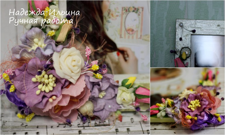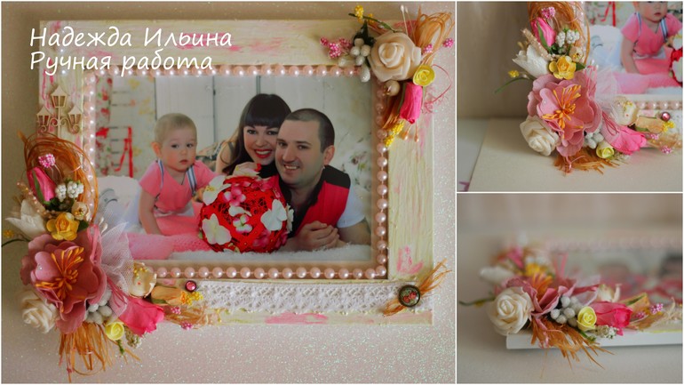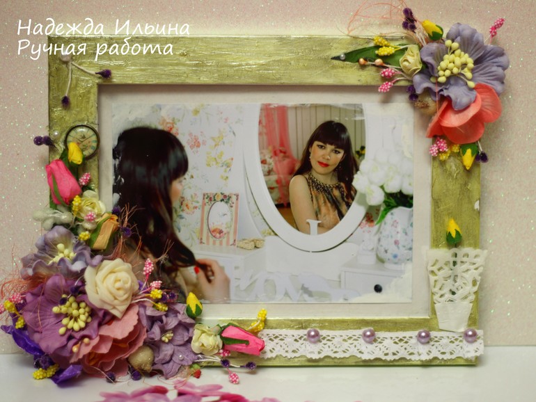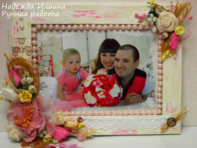 Декорированная рамка в стиле Шебби Шик. Бумажные цветы, искусственный жемчуг, лента шебби, кружево, декоративные украшения. Вот так вот можно красиво оформить.