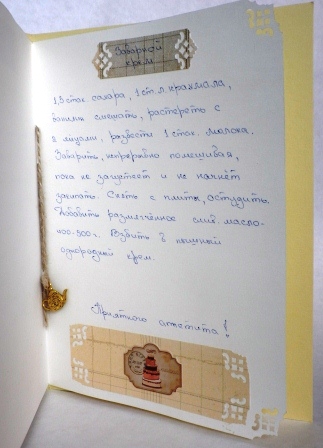 Внутри открытки вставка с рецептом,прошитая веревочкой,которую можно развязать и хранить рецепт отдельно от открытки.