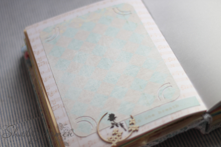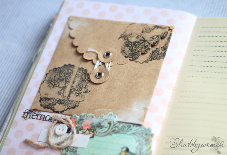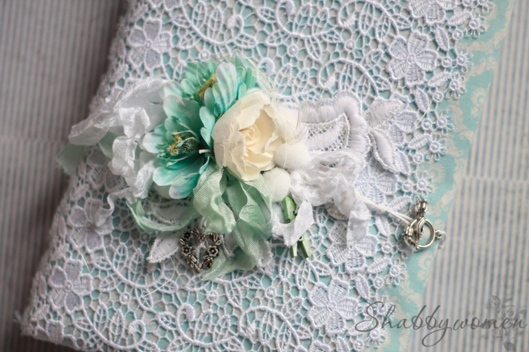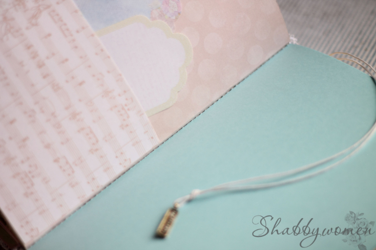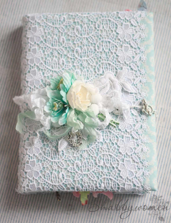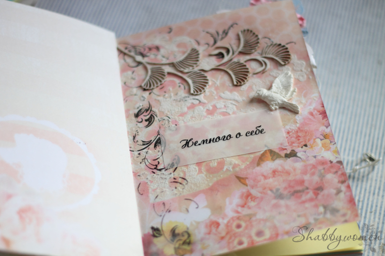 Полностью ручная работа ( сделана с нуля). В ней разноцветные странички пастельных оттенков, мягкая тканевая обложка украшена белоснежным кружевом, закрывается на серебристый замочек, на листах- разделах предусмотрены места для фотографий, конвертики и кармашки для дорогих памятных вещей.