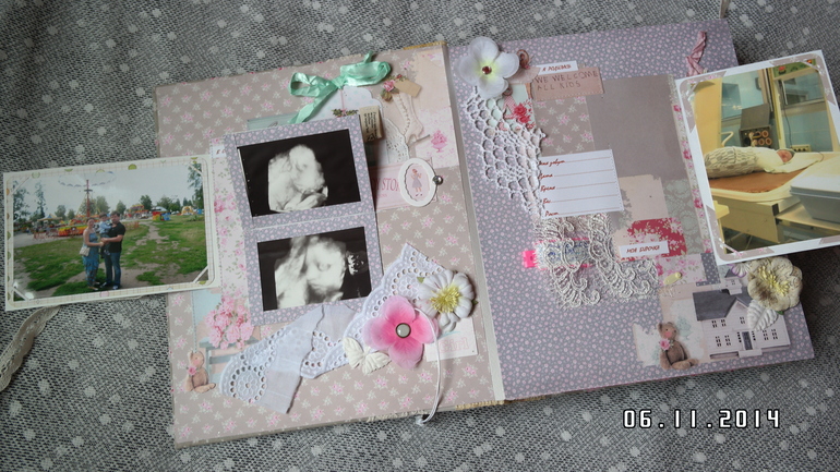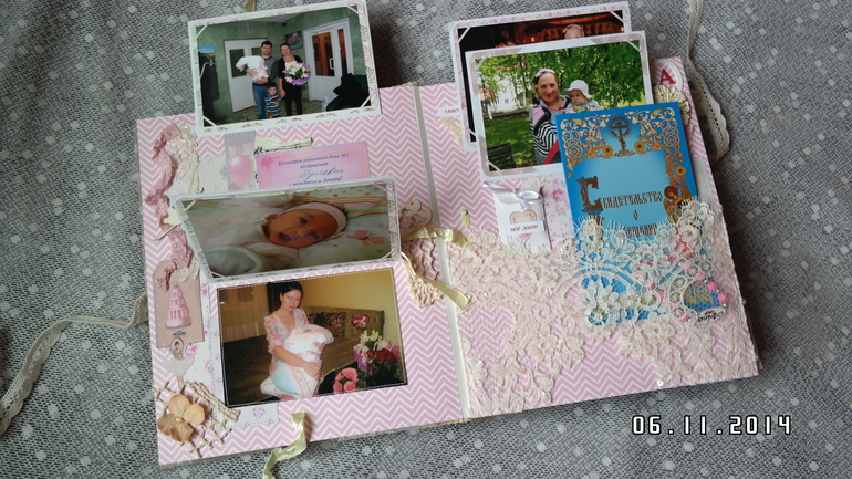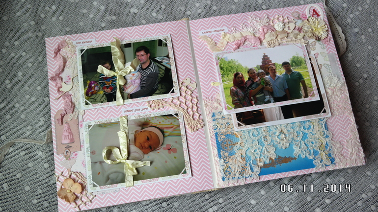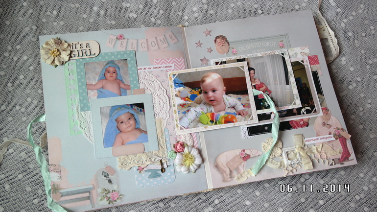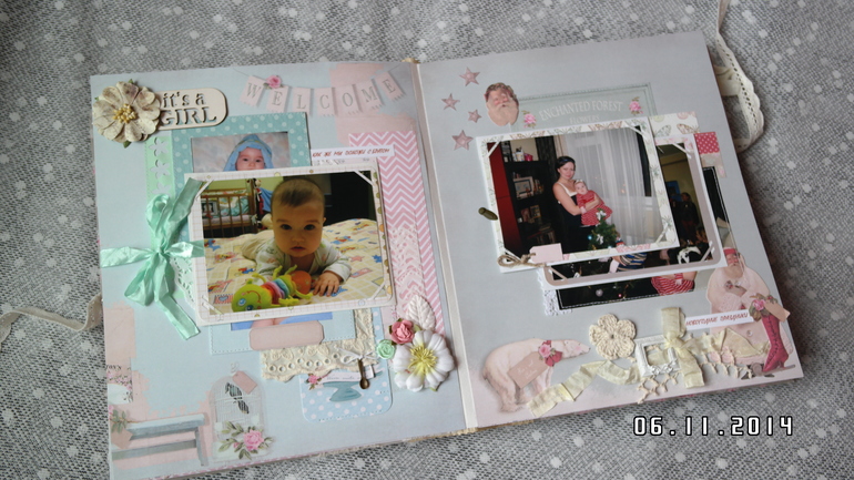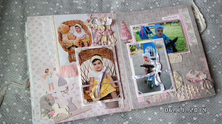 Альбомы ДетскиеВсем привет! Хочу сегодня сегодня показать альбом для моей любимой доченьки Аринушки! Долго копила идеи для него, вдохновлялась работами замечательных скрапмастериц и вот он появился! Тематические странички про ожидании, рождение, выписку, семью, новый год и многое др. Замечательная Тильдочка на обложке. В альбоме есть текст (значение ее имени, ее талисманы). Почти все страницы, обложка и украшения из коллекции Тильда. Получился очень объемный почти 8 см, формат 25 на 30 см, 9 разворотов,18 страниц, поместилось около 100 фото 10 на 15, красивый кружевной карман для для свидетельства о крещении, таблички - ножка, ладошка, метрика, первые слова, конвертики для зубика и локона, книжечка со снимками УЗИ, карман в конце альбома для дополнительных фото и диска. Очень много раскладушек для фото и книжечка для записей достижений доченьки.