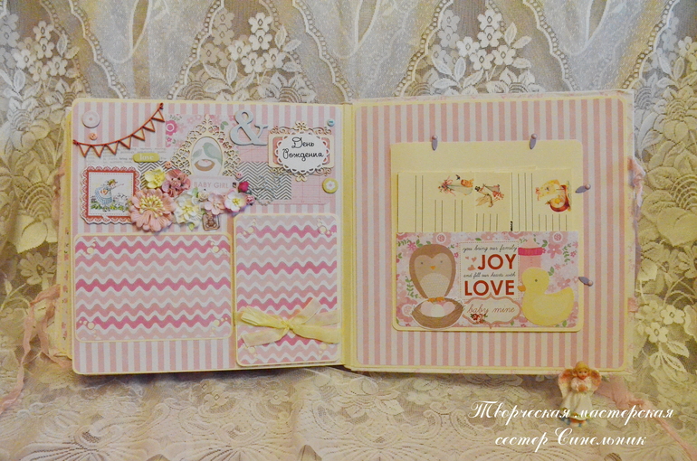 Страничка про первый день рождения и кармашки для диска, карточек с достижениями и оставшихся фото.