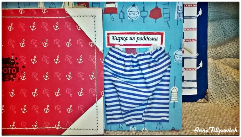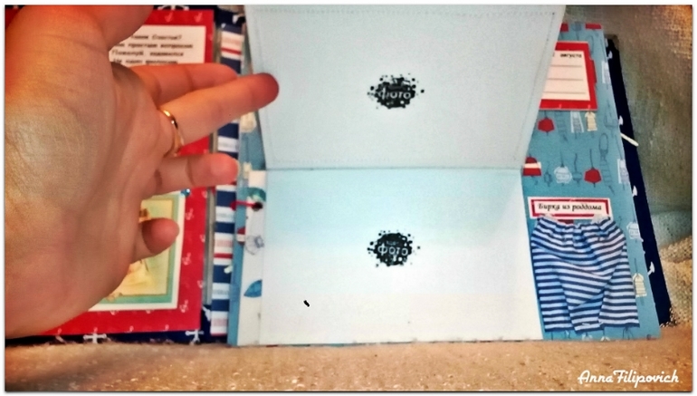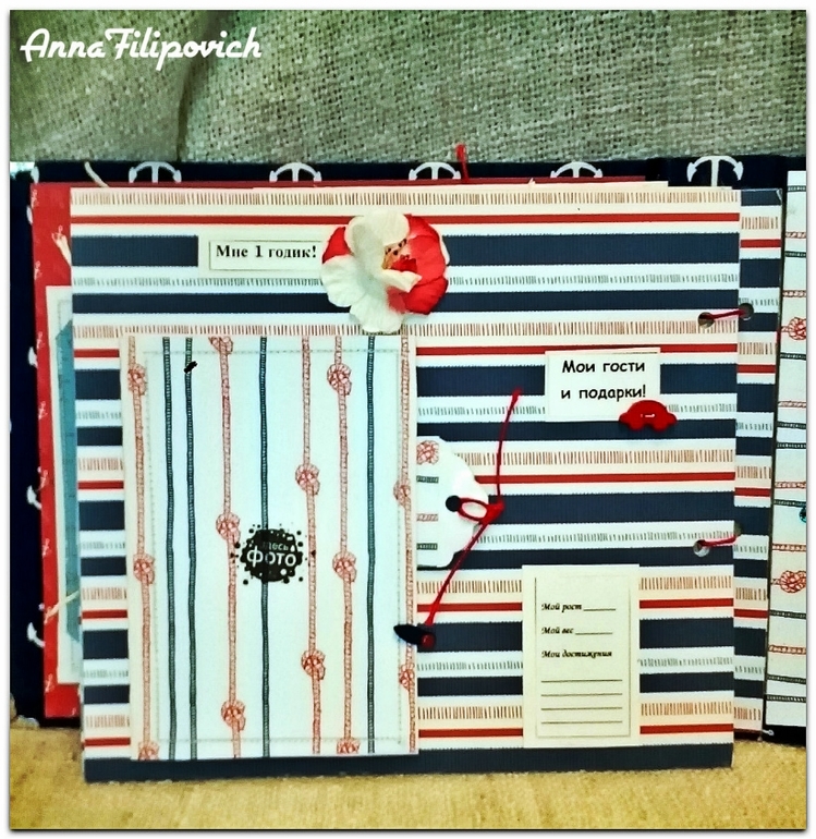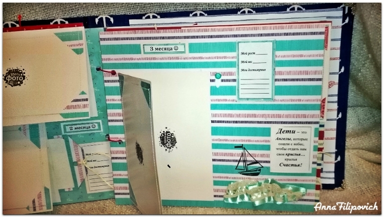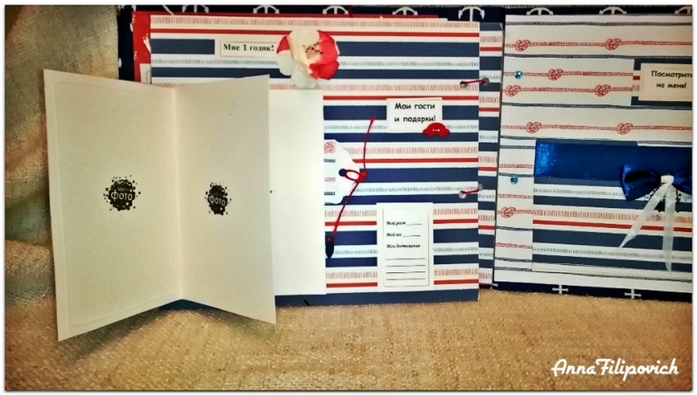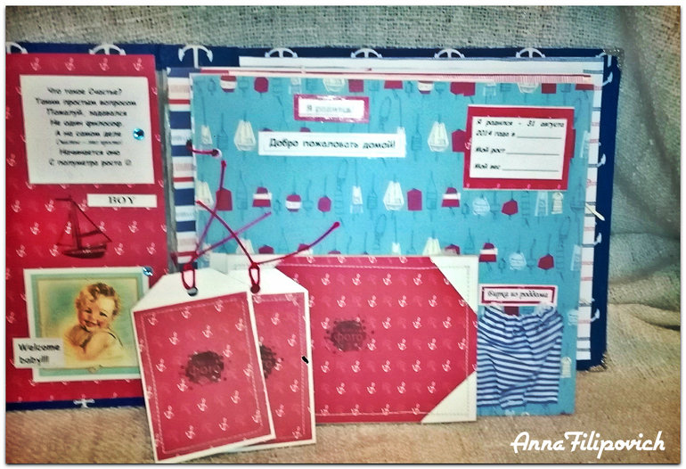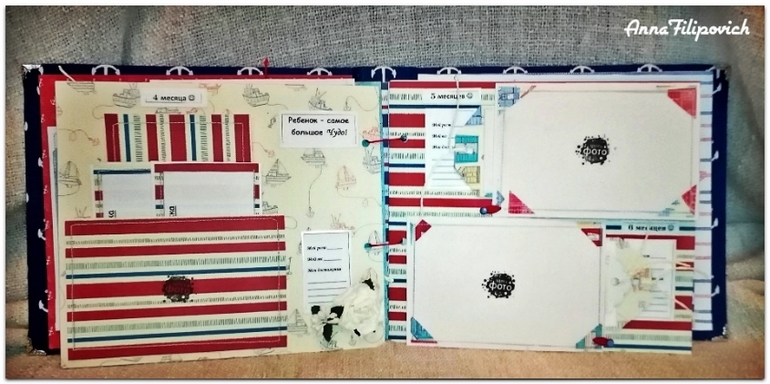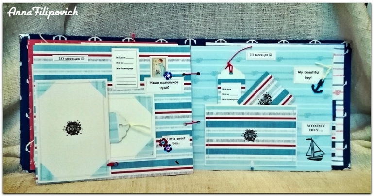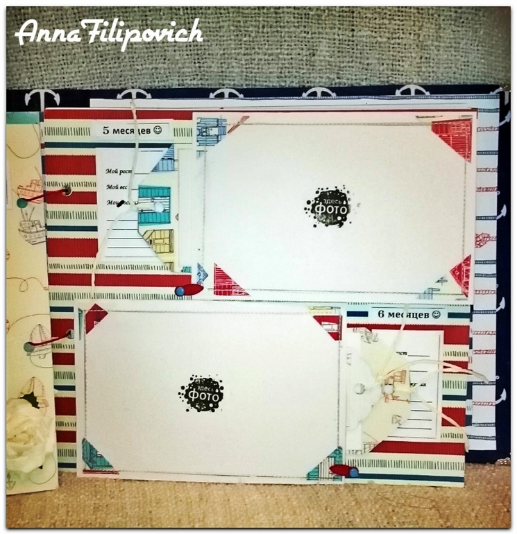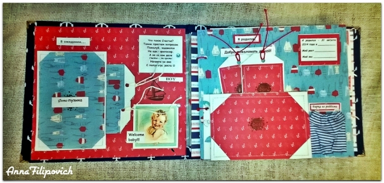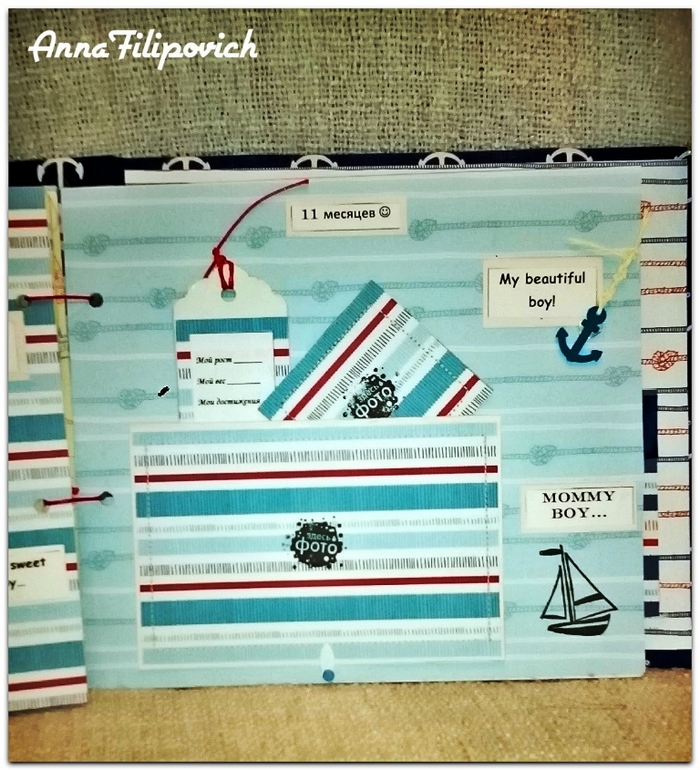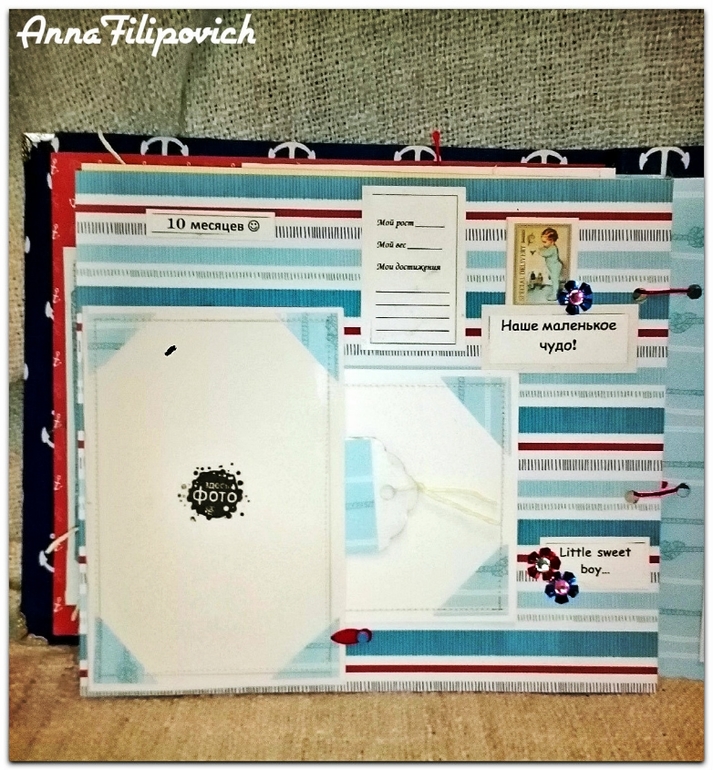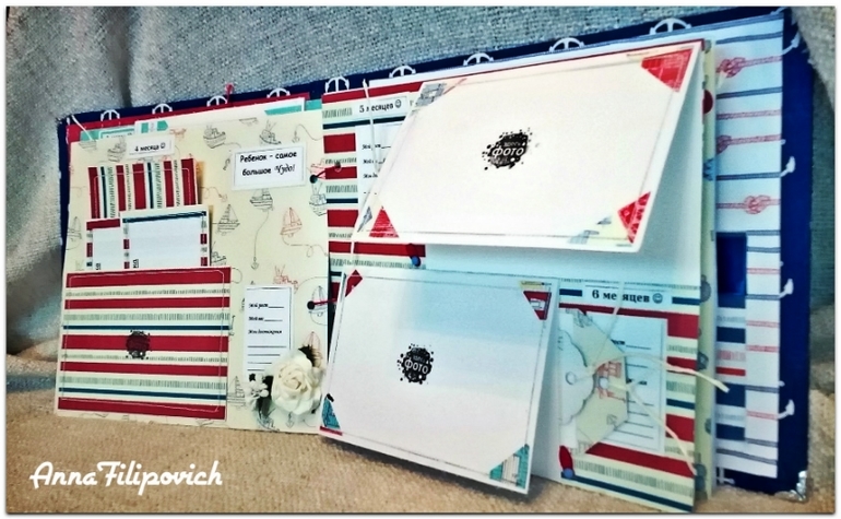 Альбом сделан в морском стиле. Размер 20 см на 25 см. Вмещает 57 фото. Имеется кармашек для бирки из роддома, карточки для фото (или отпечатки) ручки и ножки, карточки для записий,