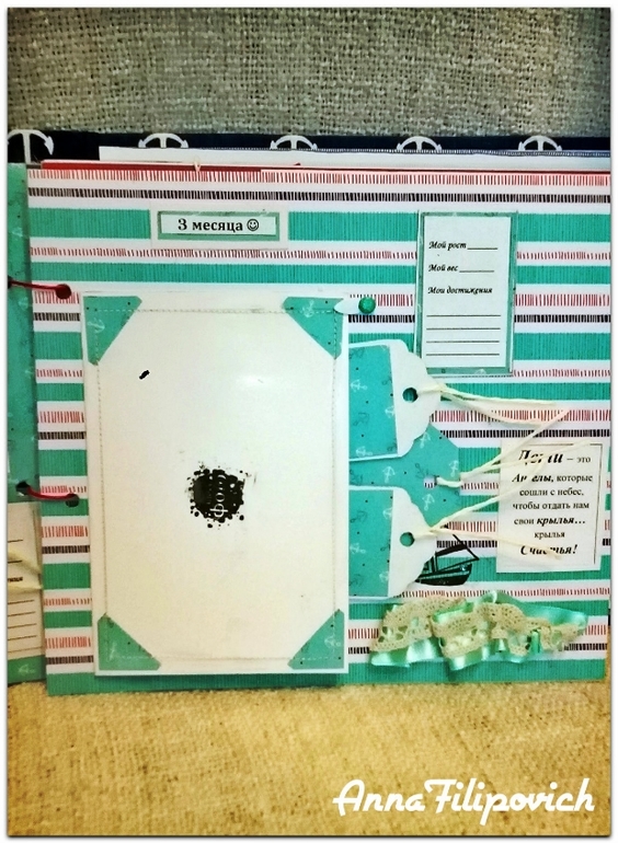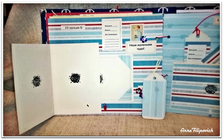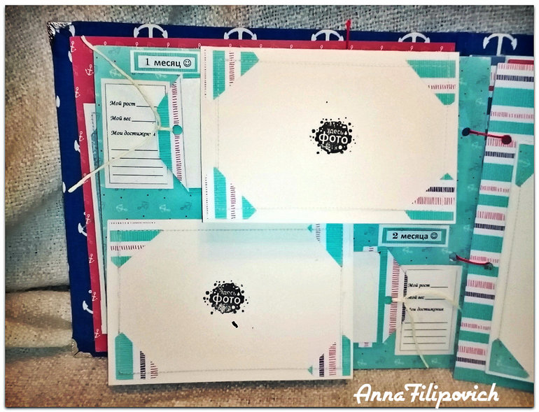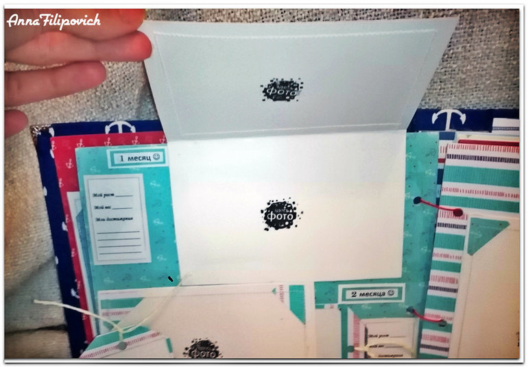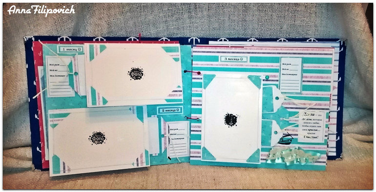 На второй странице - 3 месяца... Вмещает 3 фото 9 на 12, один тег с мини-фото и теги для записей) Все подложки для фото держаться на анкерах.