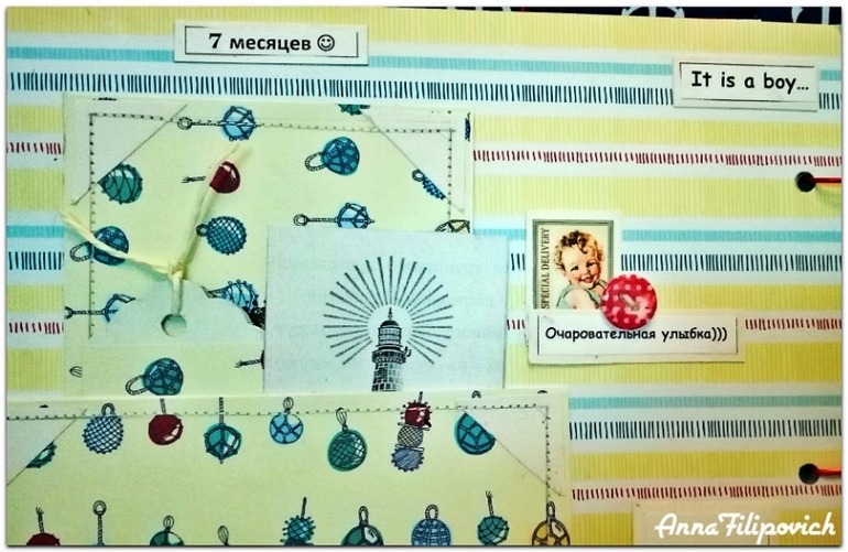 Четвёртый разворот и ... 7, 8 и 9 месяцев Вмещает 7 фото 9 на 12, 1 мини-тег для записей и 1 тег на 2 мини-фото.